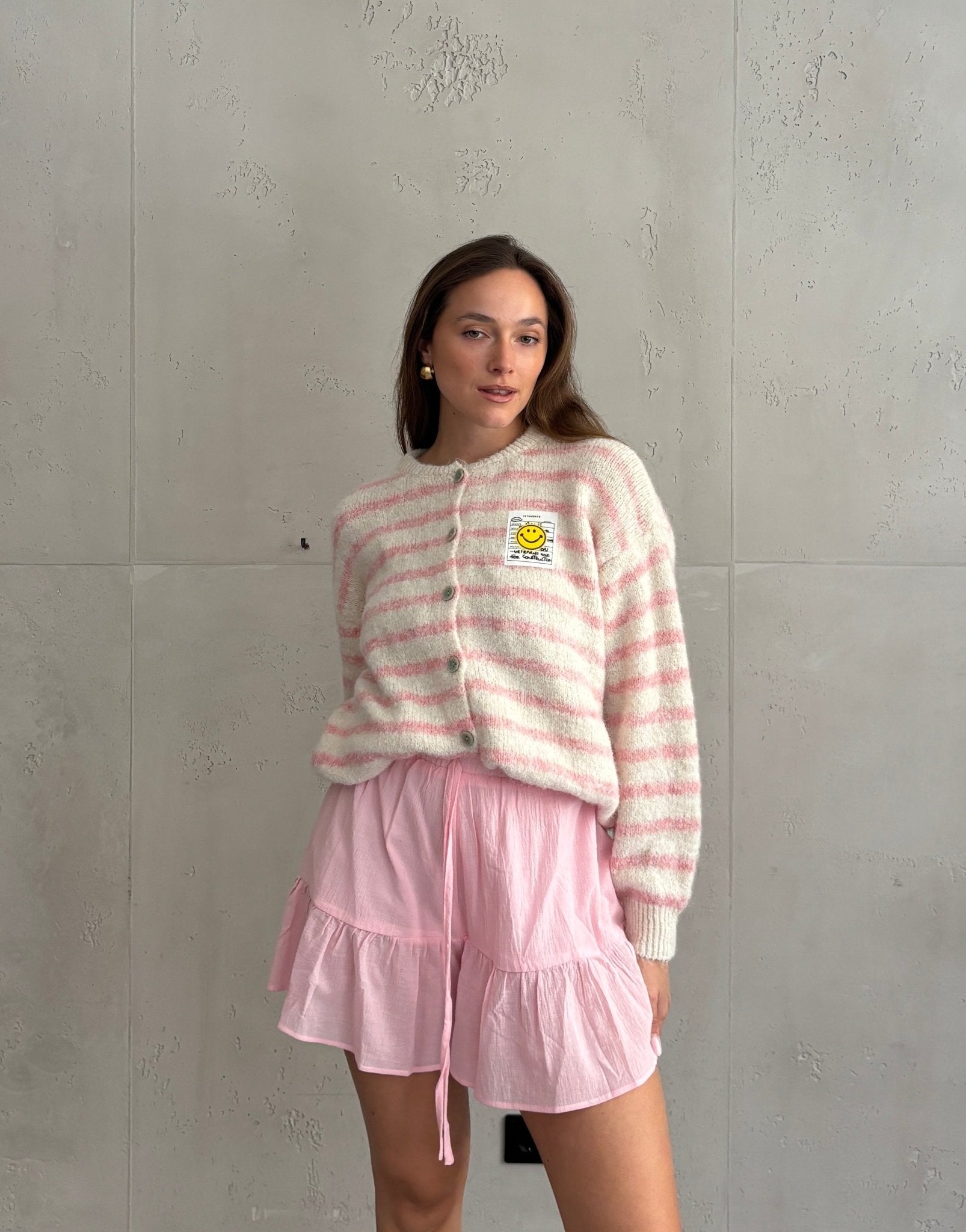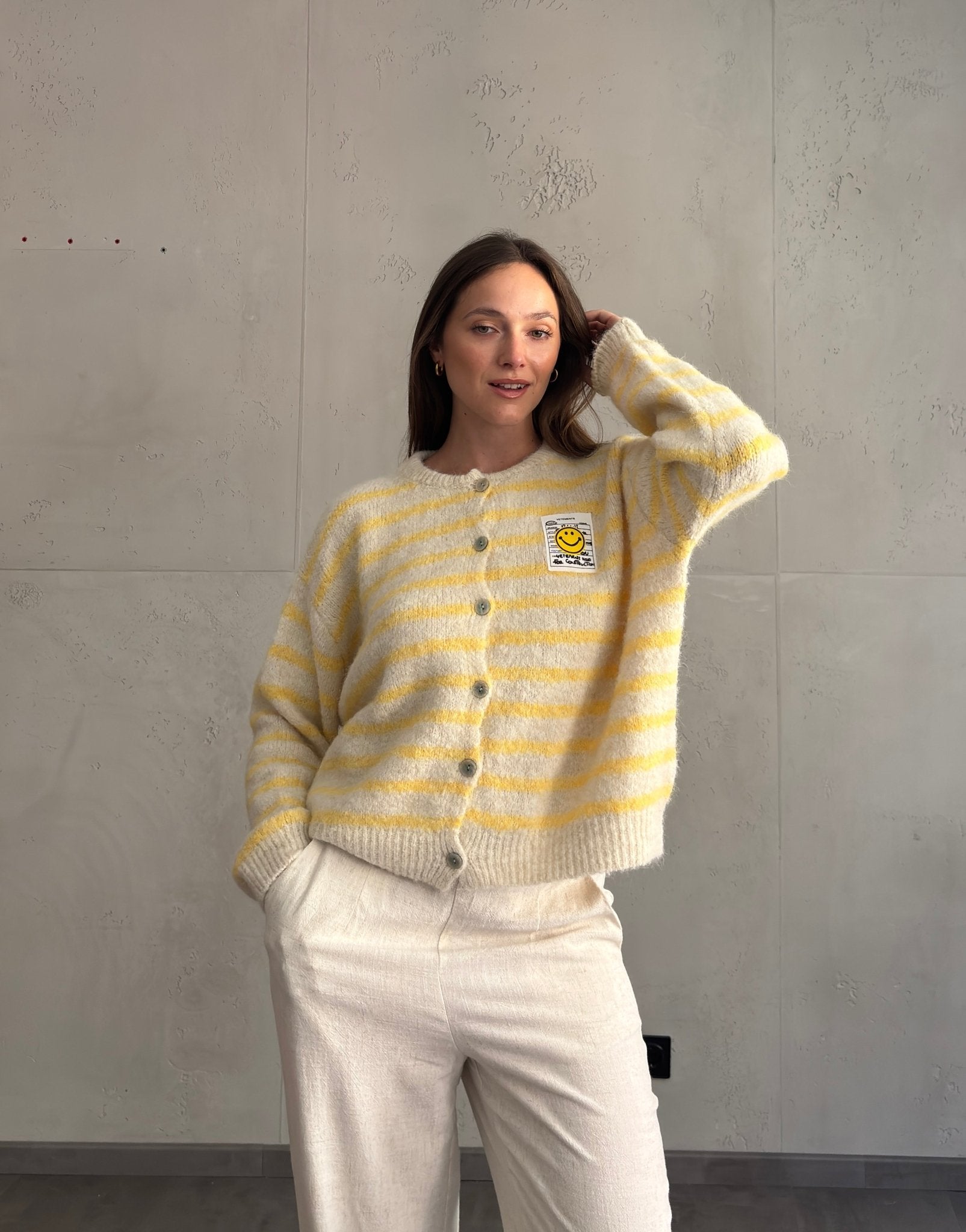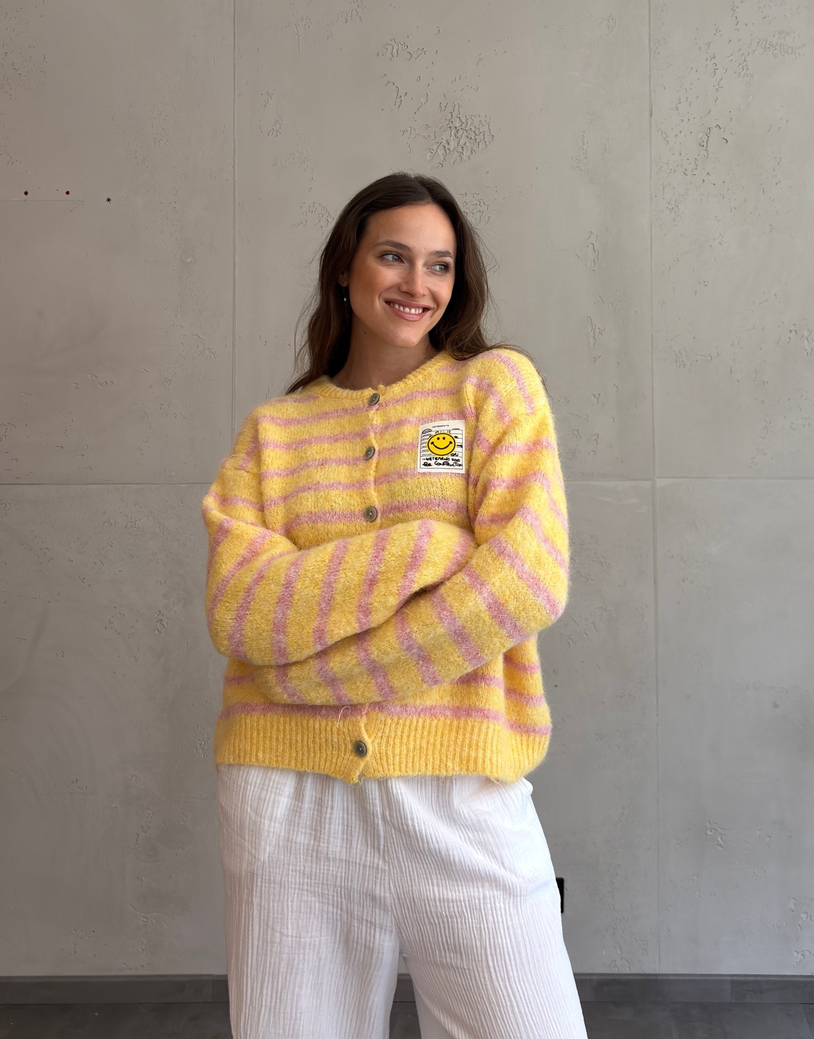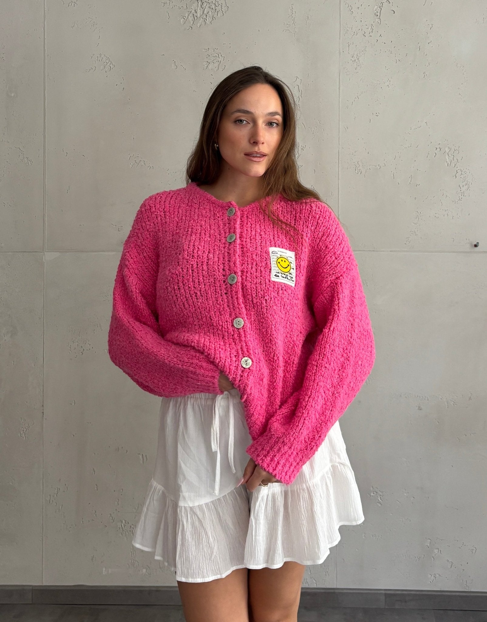 2 BewertungenBouclé Strickjacke mit Smiley Patch