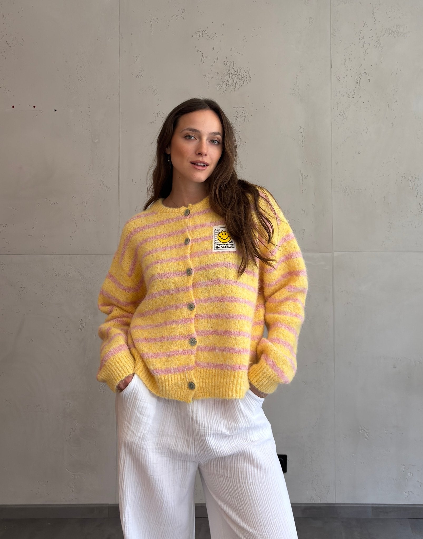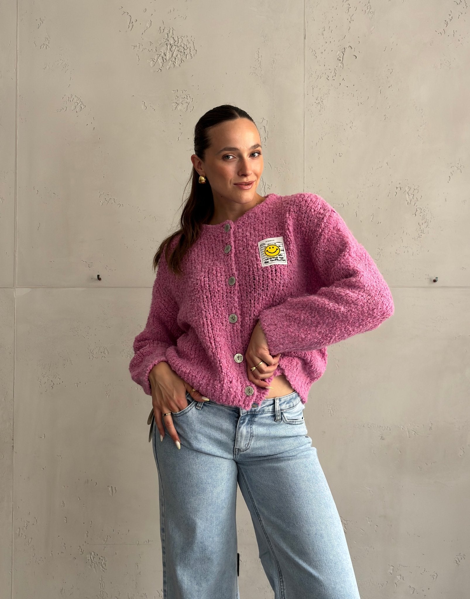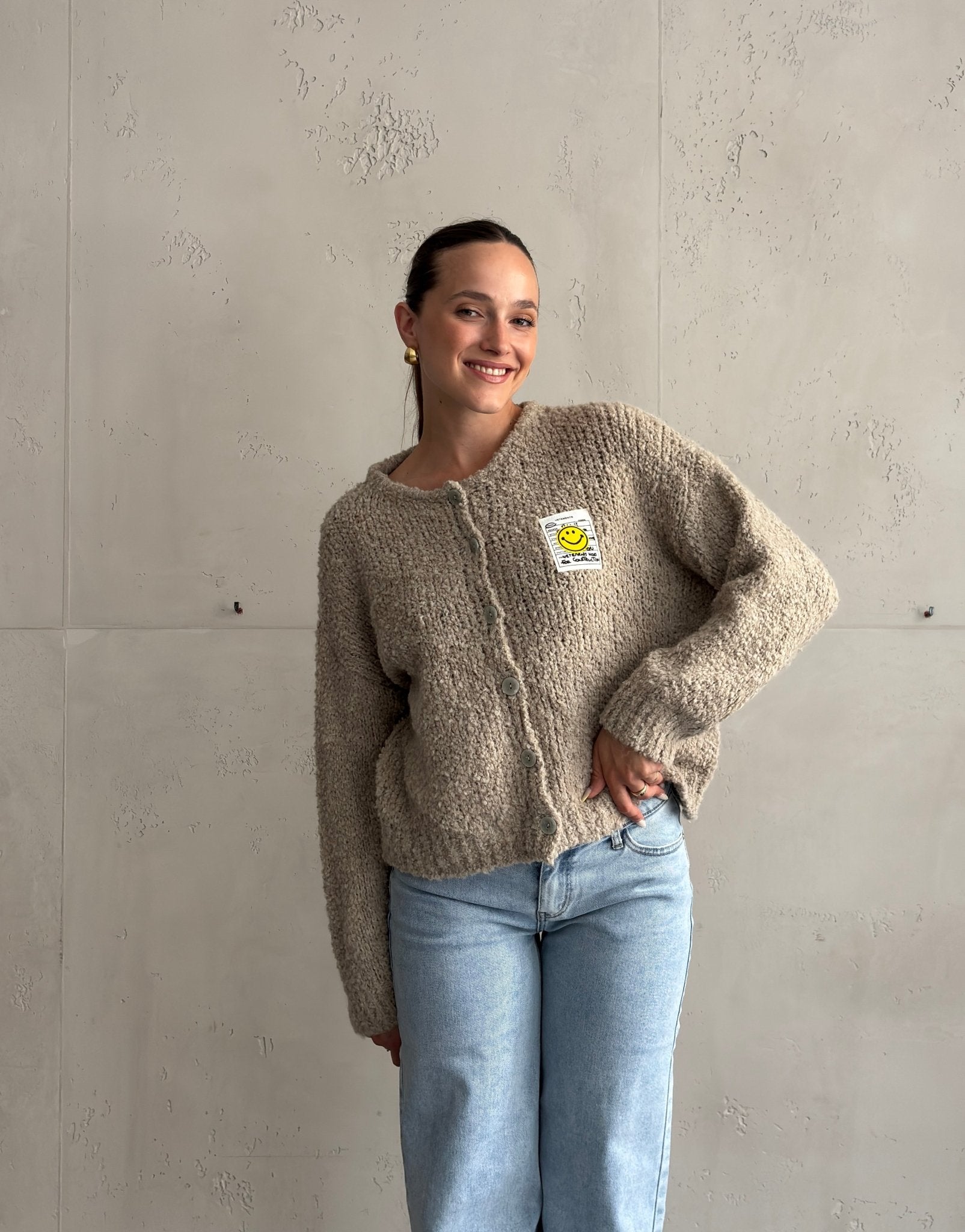 2 BewertungenBouclé Strickjacke mit Smiley Patch