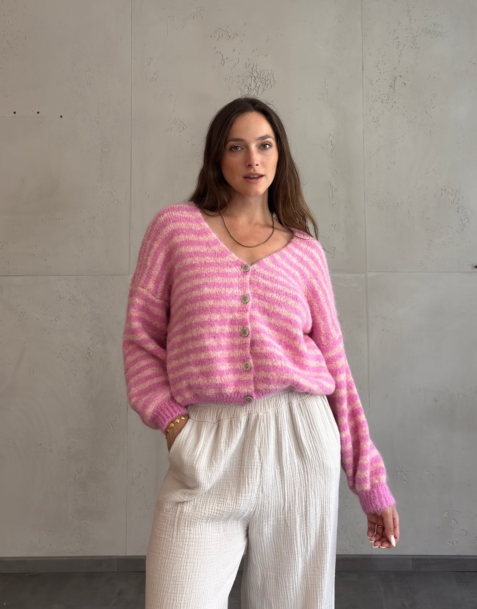 1 BewertungGestreifte Strickjacke mit V-Ausschnitt