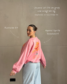 Das Sweatshirt ist im Oversize Fit geschnitten, was bedeutet, dass es großzügig und locker sitzt. Es passt in der Regel von Größe 36 bis 40 und bietet dadurch viel Komfort und Flexibilität.