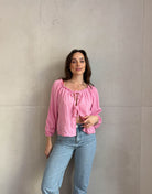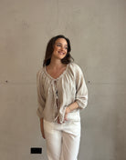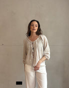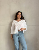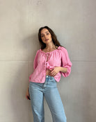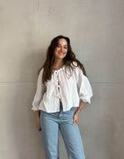 Kurze Musselinbluse mit Schleifen und Gummizug