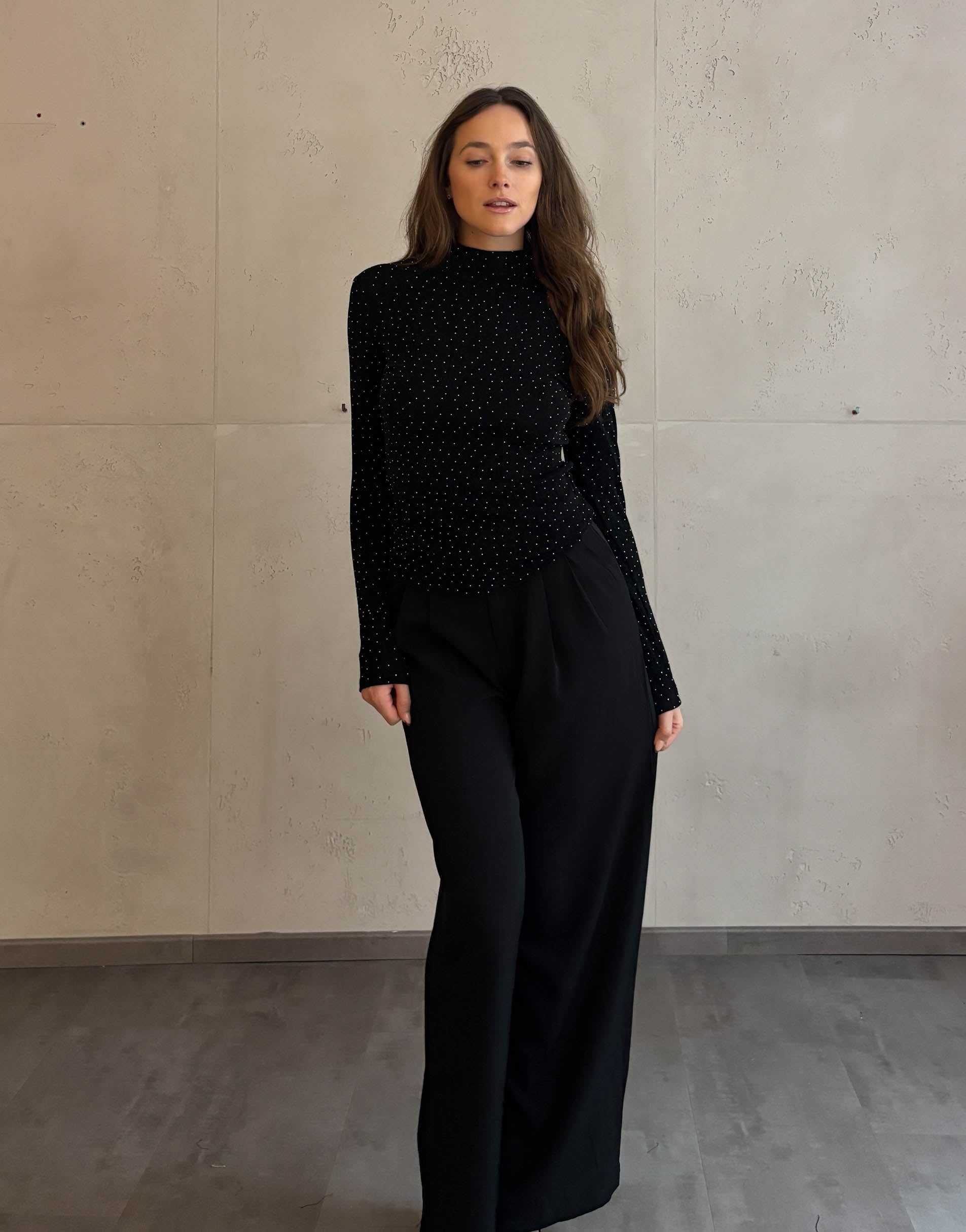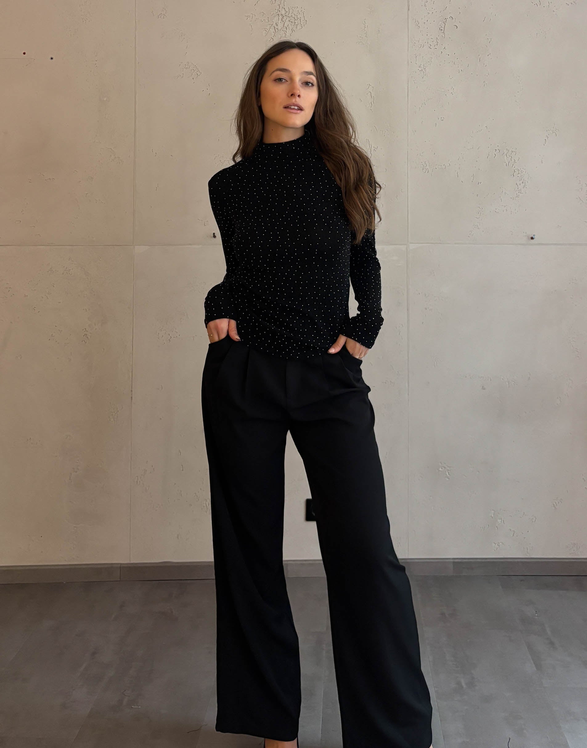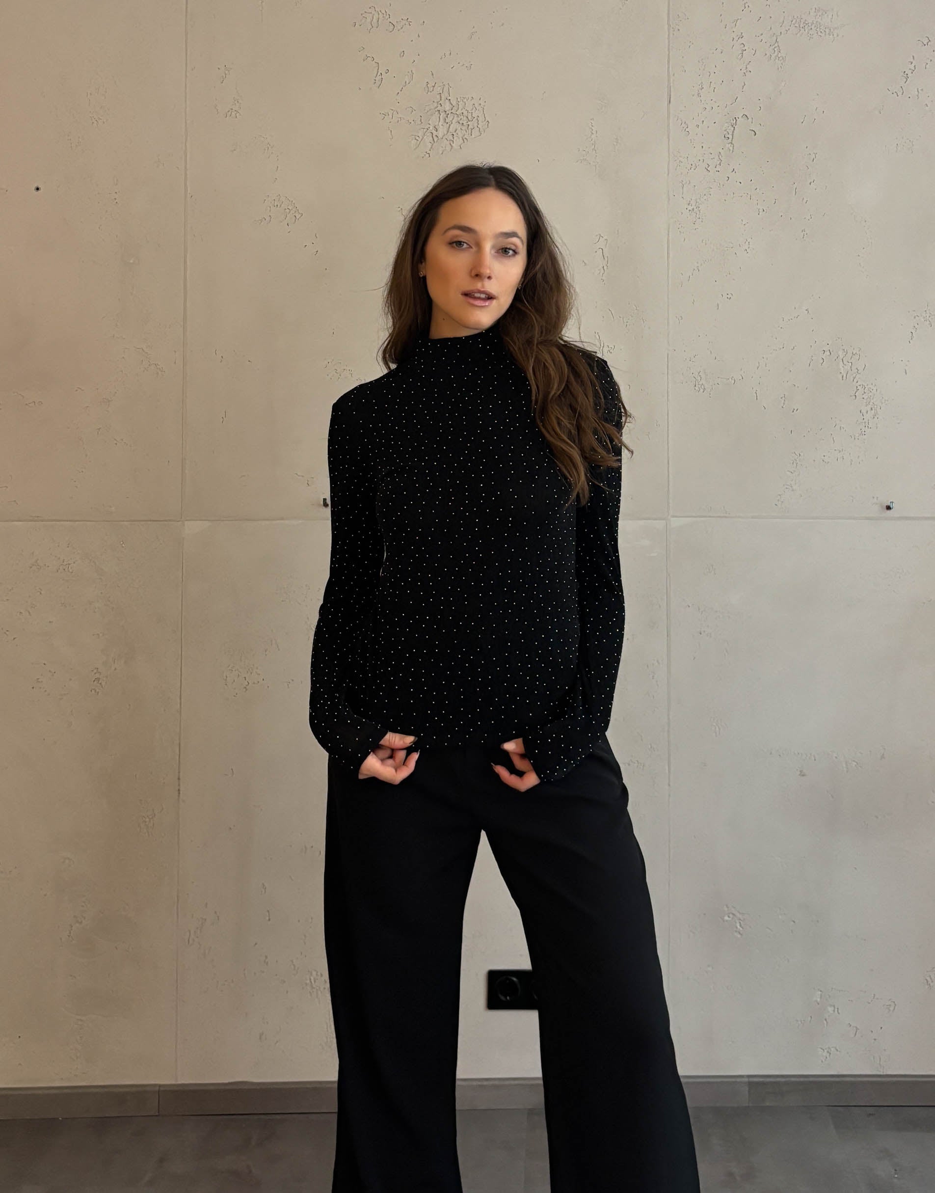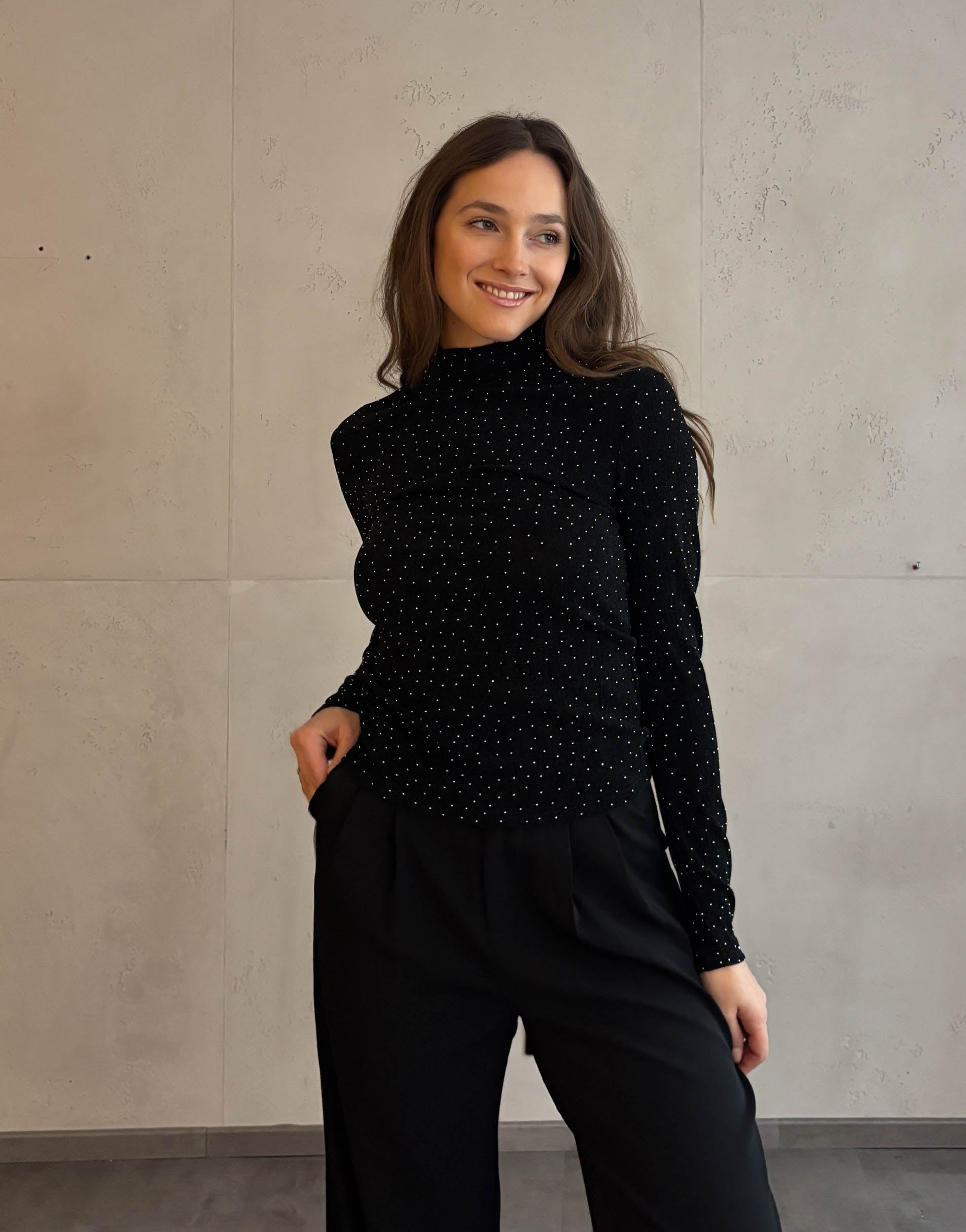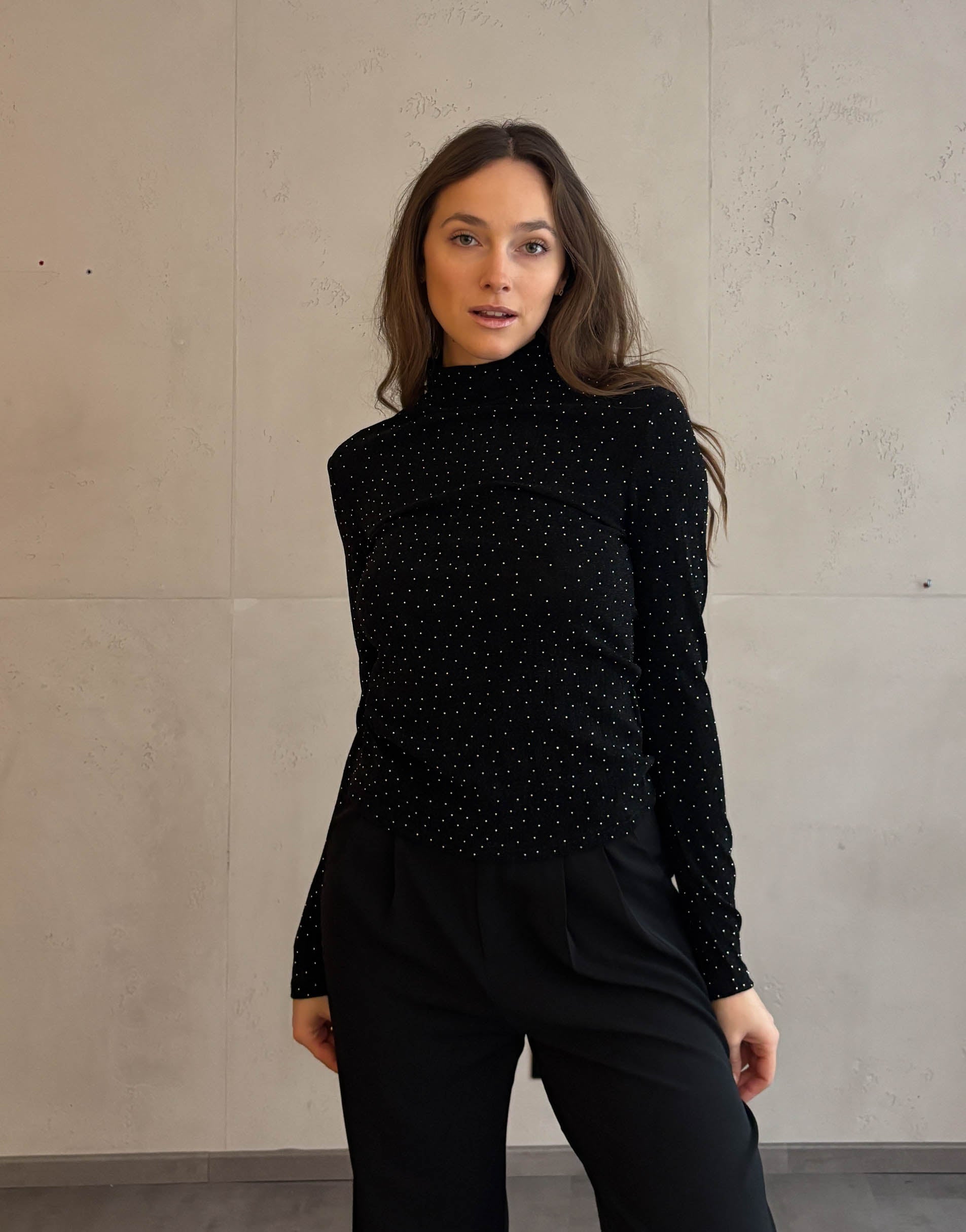 Das schwarze Basic Strass Oberteil vereint Eleganz und Glamour in einem Design. Der Stehkragen verleiht dem Look einen sophisticated Touch, während die eng anliegende Passform deine Figur perfekt betont. Der dezente Strass-Effekt bringt genau die richtige Portion Glanz in dein Outfit – ideal für festliche Anlässe oder besondere Momente.