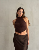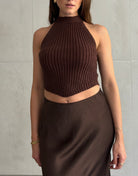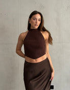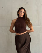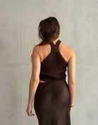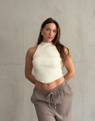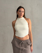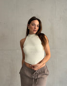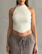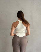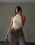 Ja. Der elastische Rippenstrick schmiegt sich an, ohne einzuengen. Das Knotendetail hinten sorgt für einen cleanen Rücken-Look.