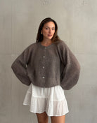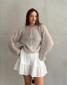 Der hohe Mohair-Anteil sorgt für einen weichen, luftigen Flaum. Bei sehr sensibler Haut empfiehlt sich ein leichtes Layer (z. B. Jersey-Top) darunter.