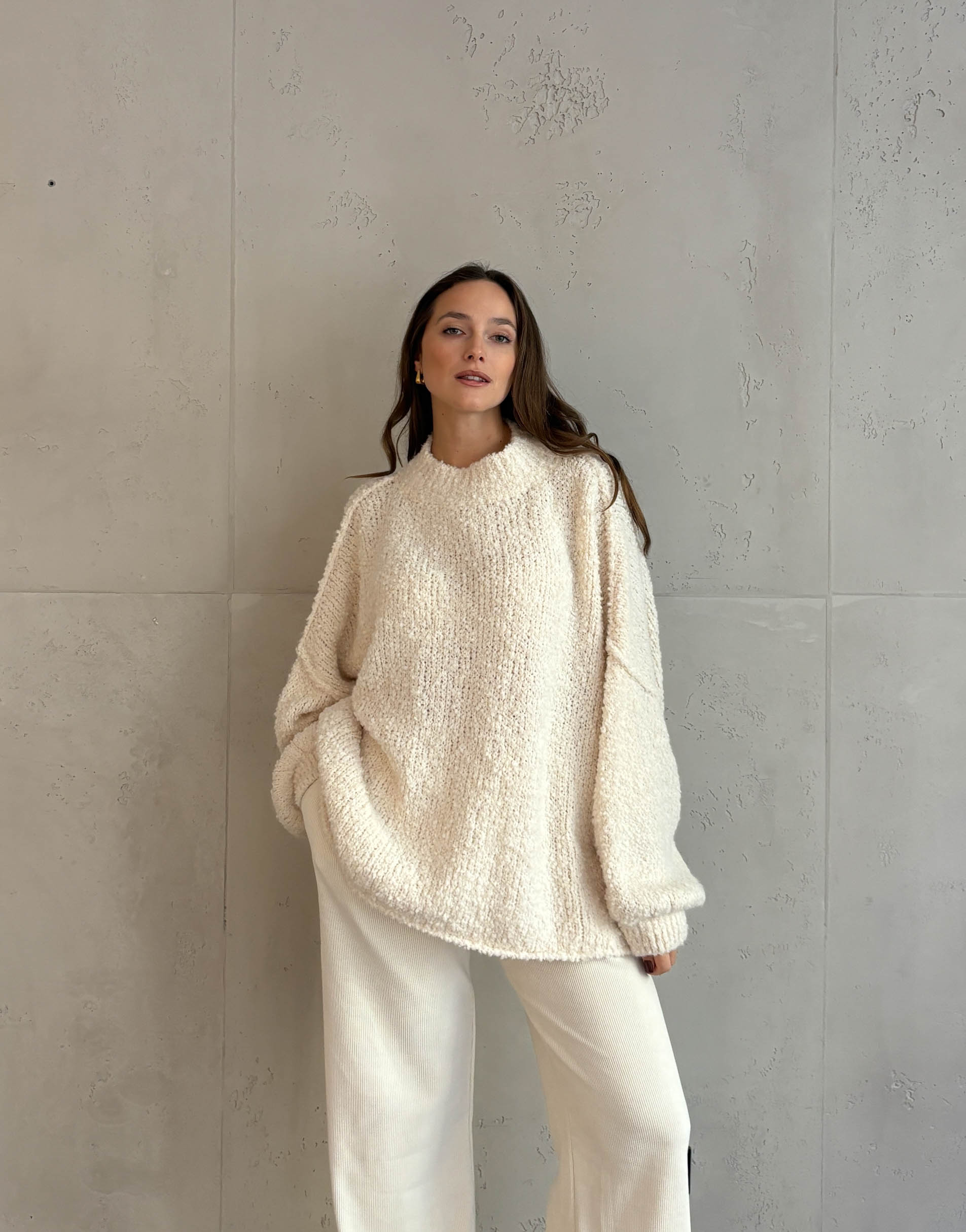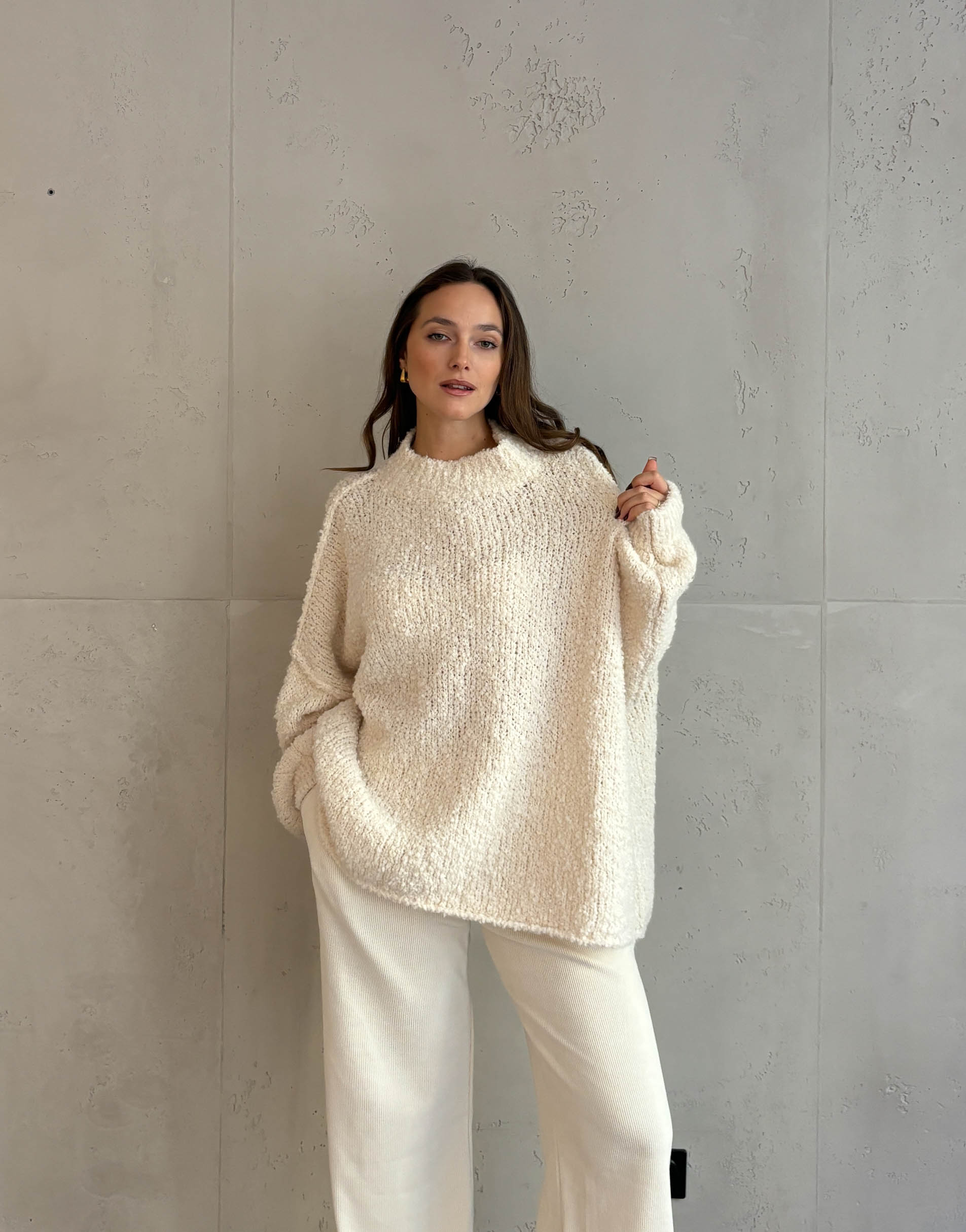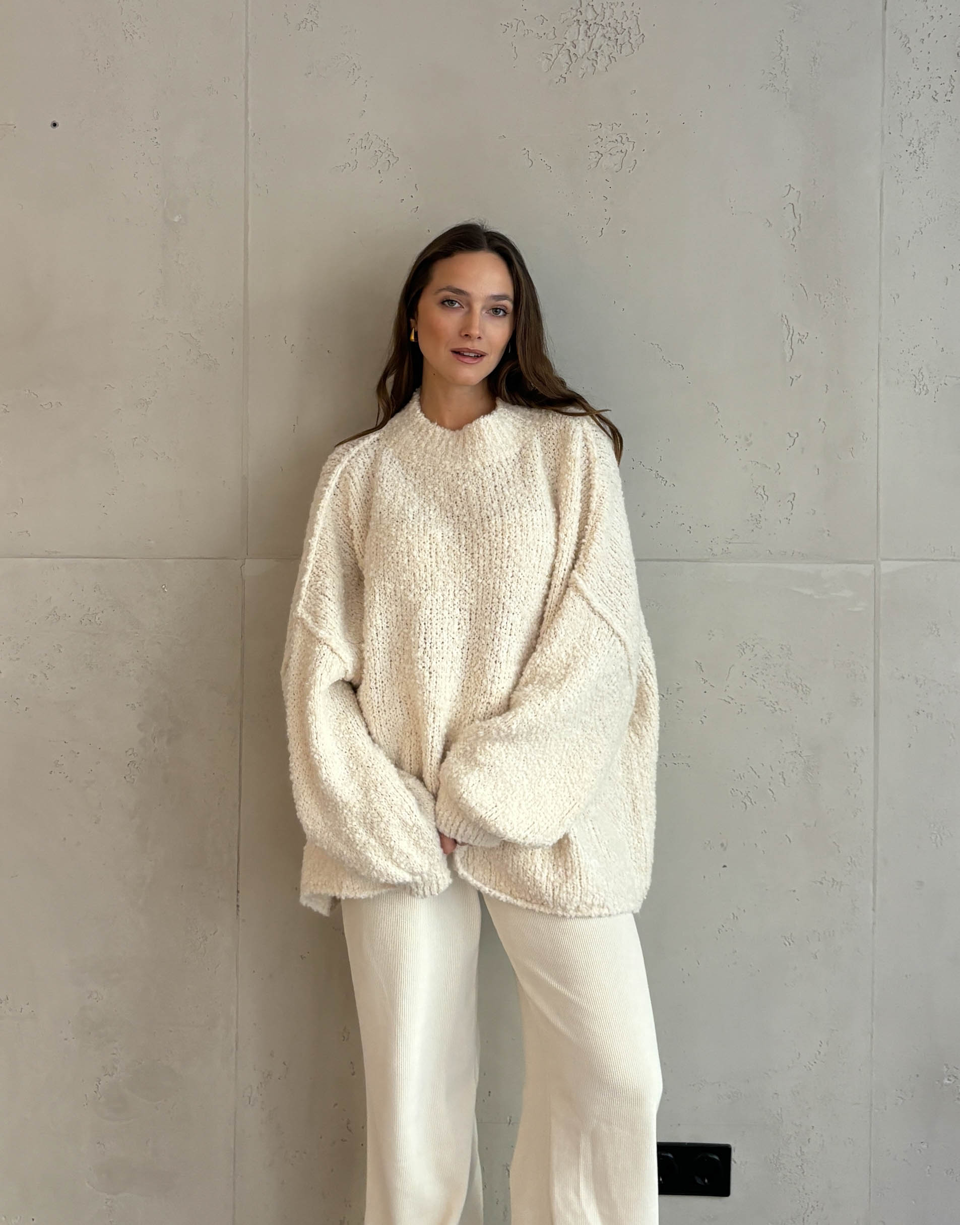 Dieser Pullover ist nicht nur ein Kleidungsstück, sondern ein echtes Statement. Der Boucle-Stil verleiht ihm eine besondere Textur, die sowohl lässig als auch elegant wirkt. Perfekt für den Alltag oder besondere Anlässe – du wirst ihn lieben!