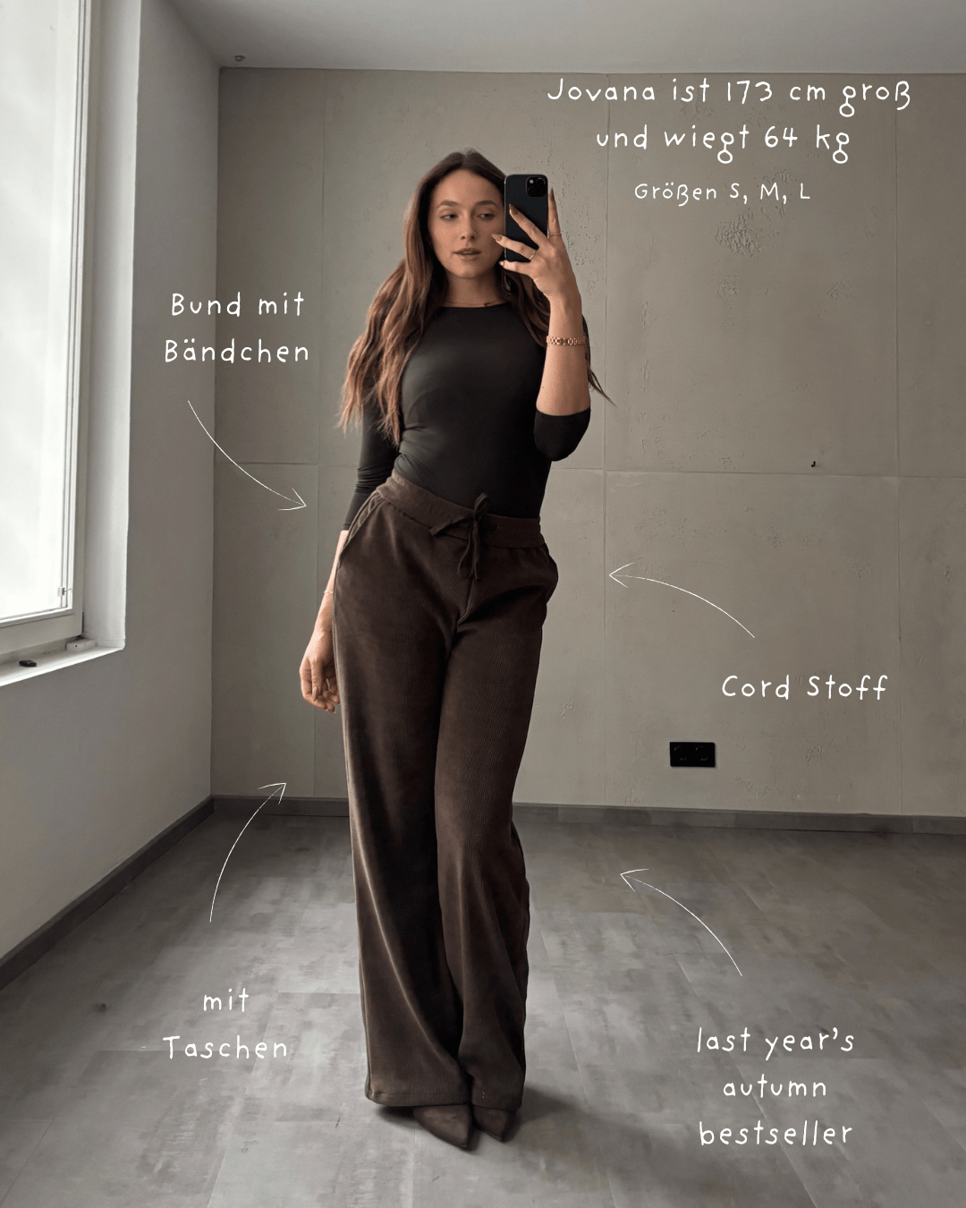 Unsere Cordhose mit weitem Bein ist in den Größen S, M und L erhältlich. Du kannst die Größe wählen, die am besten zu dir passt. Wenn du einen entspannteren Look bevorzugst, wähle einfach eine Nummer größer für zusätzlichen Komfort und einen lockeren Sitz.