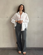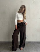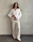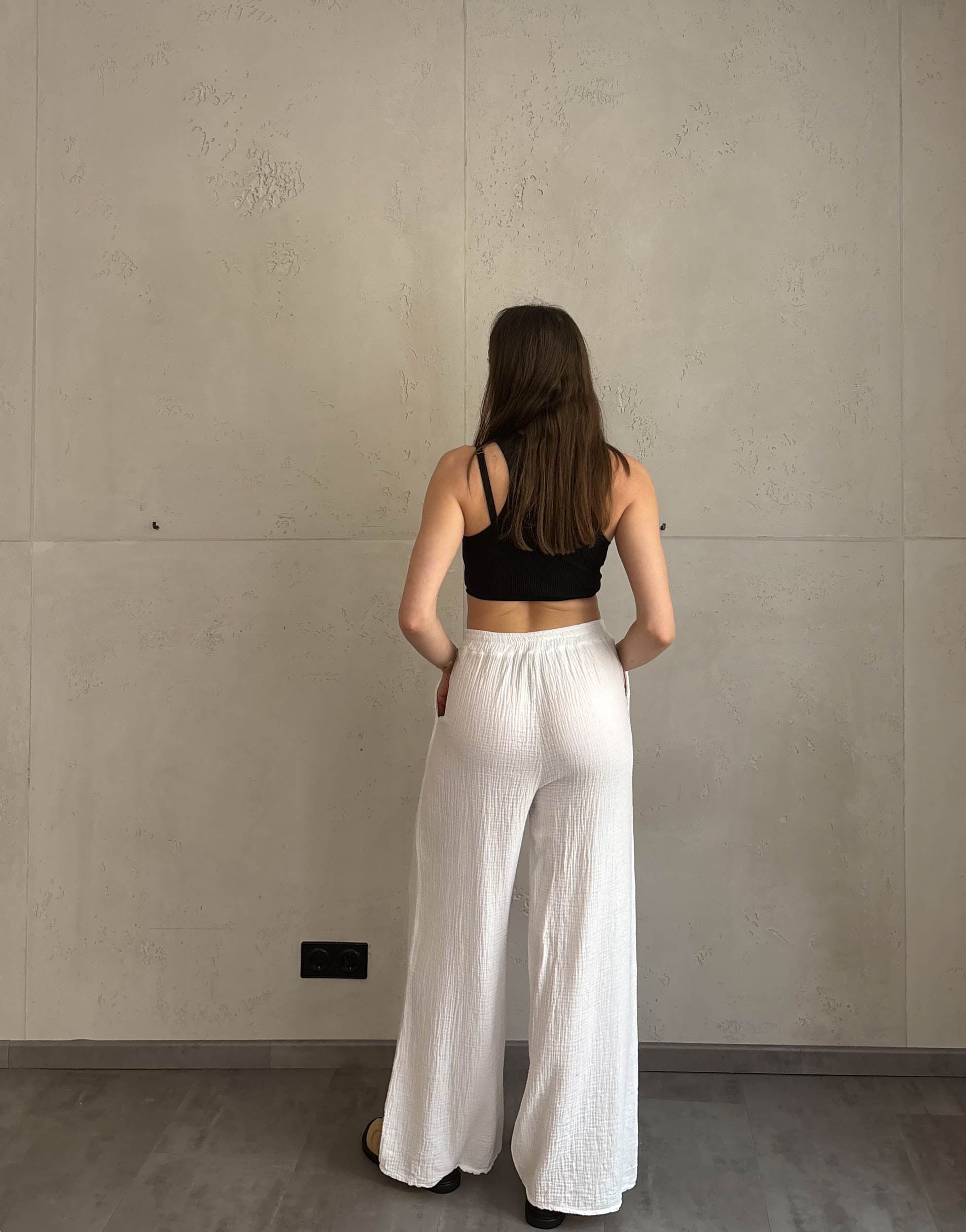 Ob für einen entspannten Tag zuhause, einen Spaziergang im Park oder als stylischer Begleiter im Büro - die Musselinhose lässt sich vielfältig kombinieren. Trage sie mit einem enganliegenden Top, um den lässigen Schnitt der Hose zu betonen, oder mit einem leichten Pullover für die kühleren Tage. Eine Statement-Tasche und minimalistische Schuhe runden den Look perfekt ab.