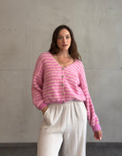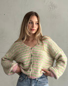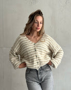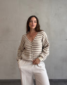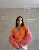 Diese gestreifte Strickjacke ist ein Must-have für jede Übergangs-Garderobe: Der V-Ausschnitt und der lockere Fit lassen vielseitige Styles zu – ob über einem Basic T-Shirt oder als Cozy-Layer über einem Sommerkleid. Die hochwertige Materialmischung sorgt für Wärme, Komfort und Formstabilität.
