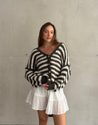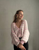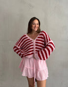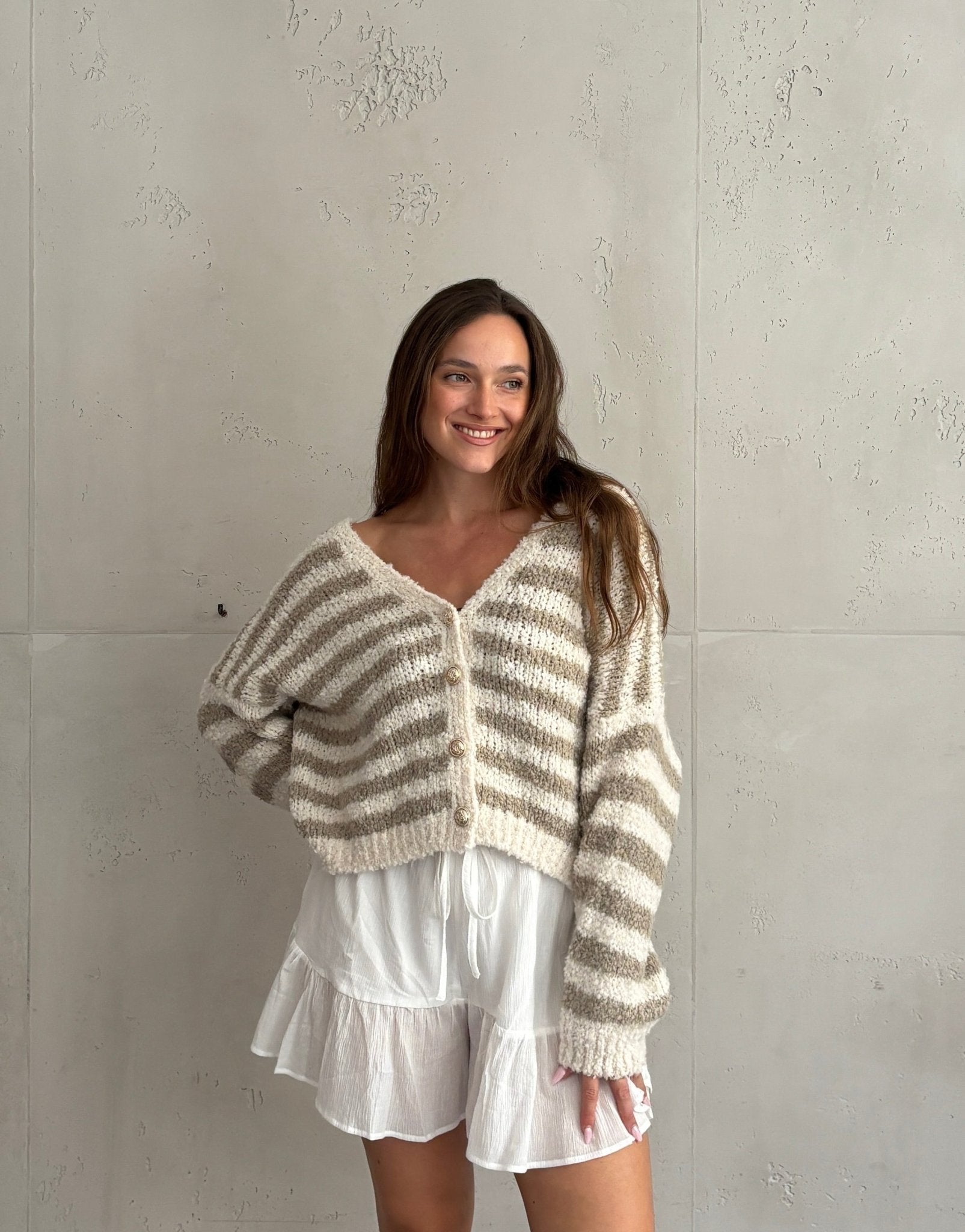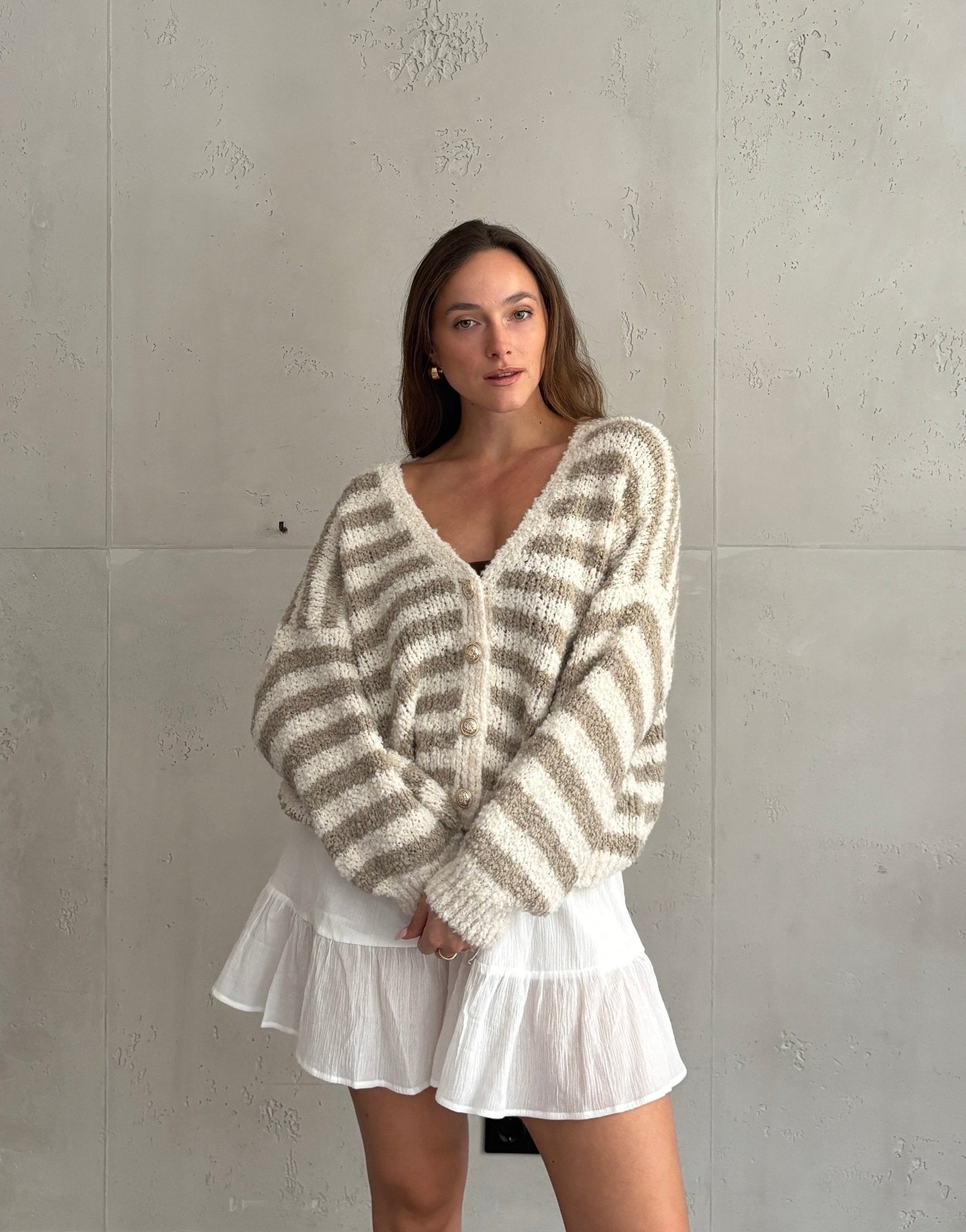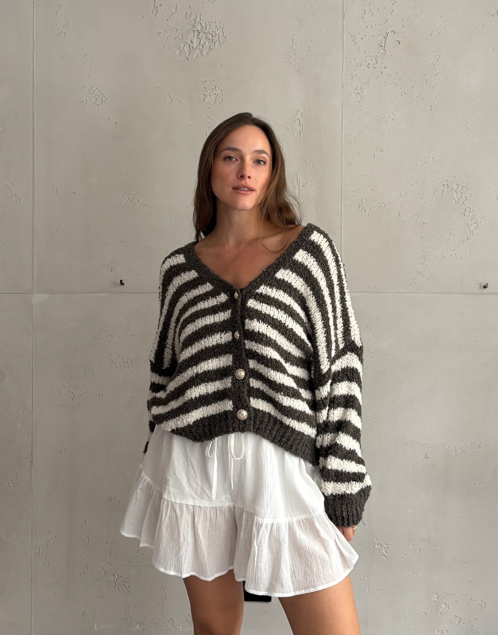 Bouclé Streifen-Strickjacke mit goldenen Knöpfen