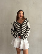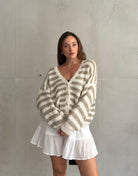 Diese Bouclé Strickjacke kombiniert feminine Details mit urbaner Lässigkeit. Das Bouclé-Garn gibt der Oberfläche eine weich-strukturierte Optik, die feinen Streifen sorgen für Ruhe und Stil. Goldene Knöpfe setzen einen leicht luxuriösen Akzent, ohne overdressed zu wirken. Ideal als Layering-Piece über feinen Tops oder unter einem Oversize-Mantel.