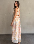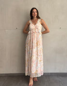 Das Flower Print Maxi Kleid in Nude vereint romantischen Charme mit modernem Twist: Gerüschte Träger und ein Cutout am Rücken machen es zum Blickfang, während der elastische Bund Komfort garantiert. Perfekt für laue Sommerabende, Gartenpartys oder als Bridal-Guest-Look.