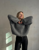 Der Pullover ist Onesize und passt ideal für Größen 36–40. Karyna (172 cm, 53 kg) trägt ihn locker im Oversized-Stil.