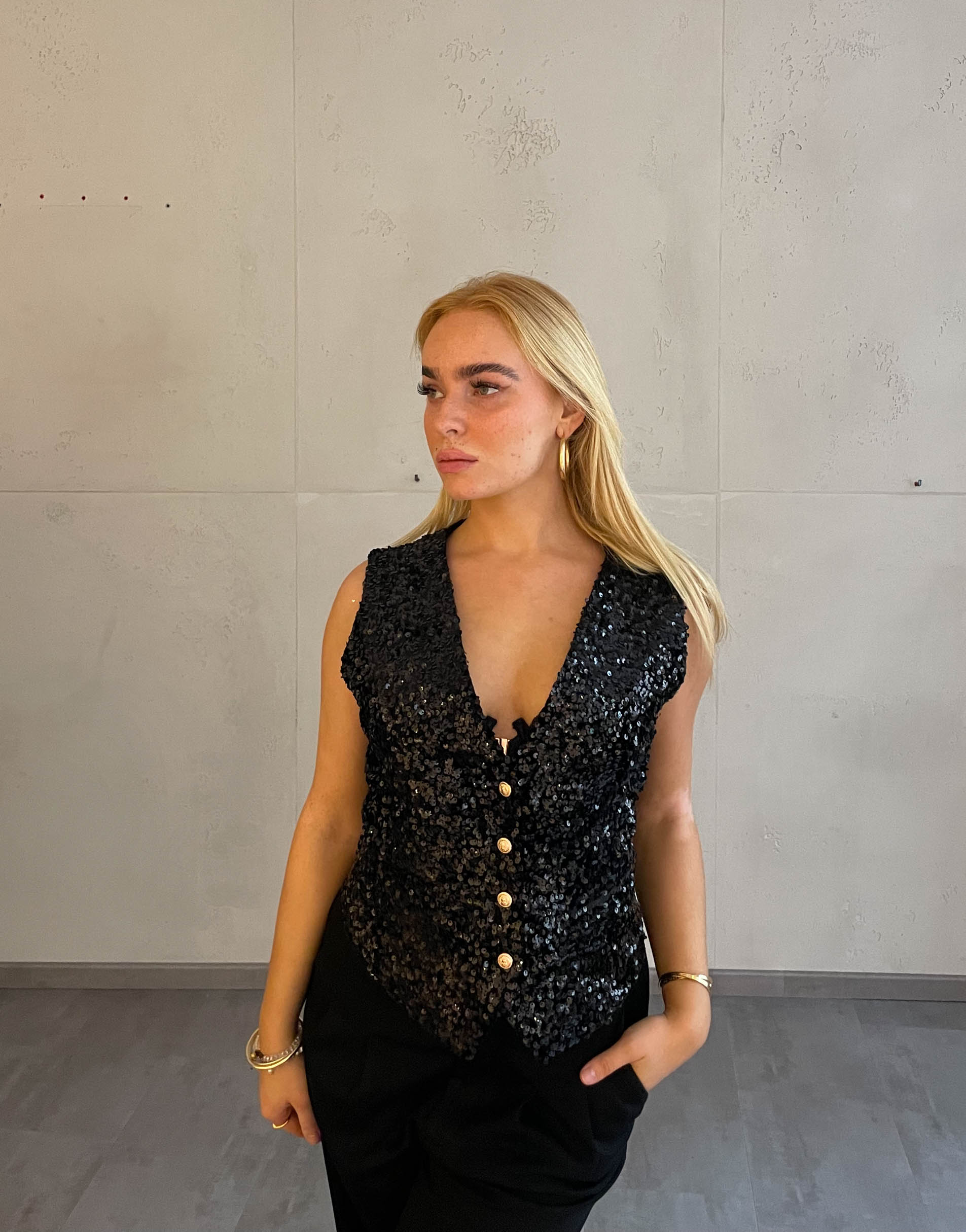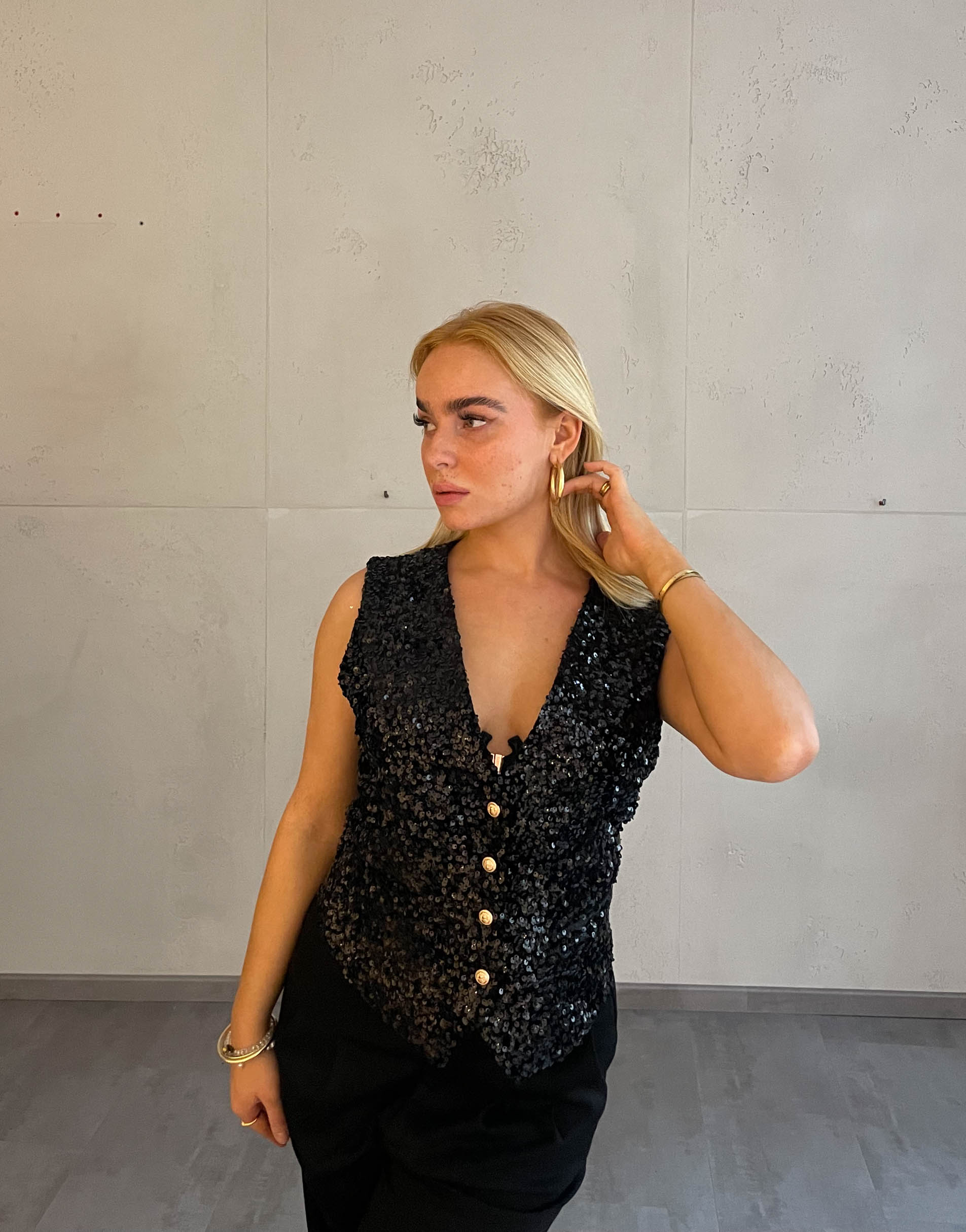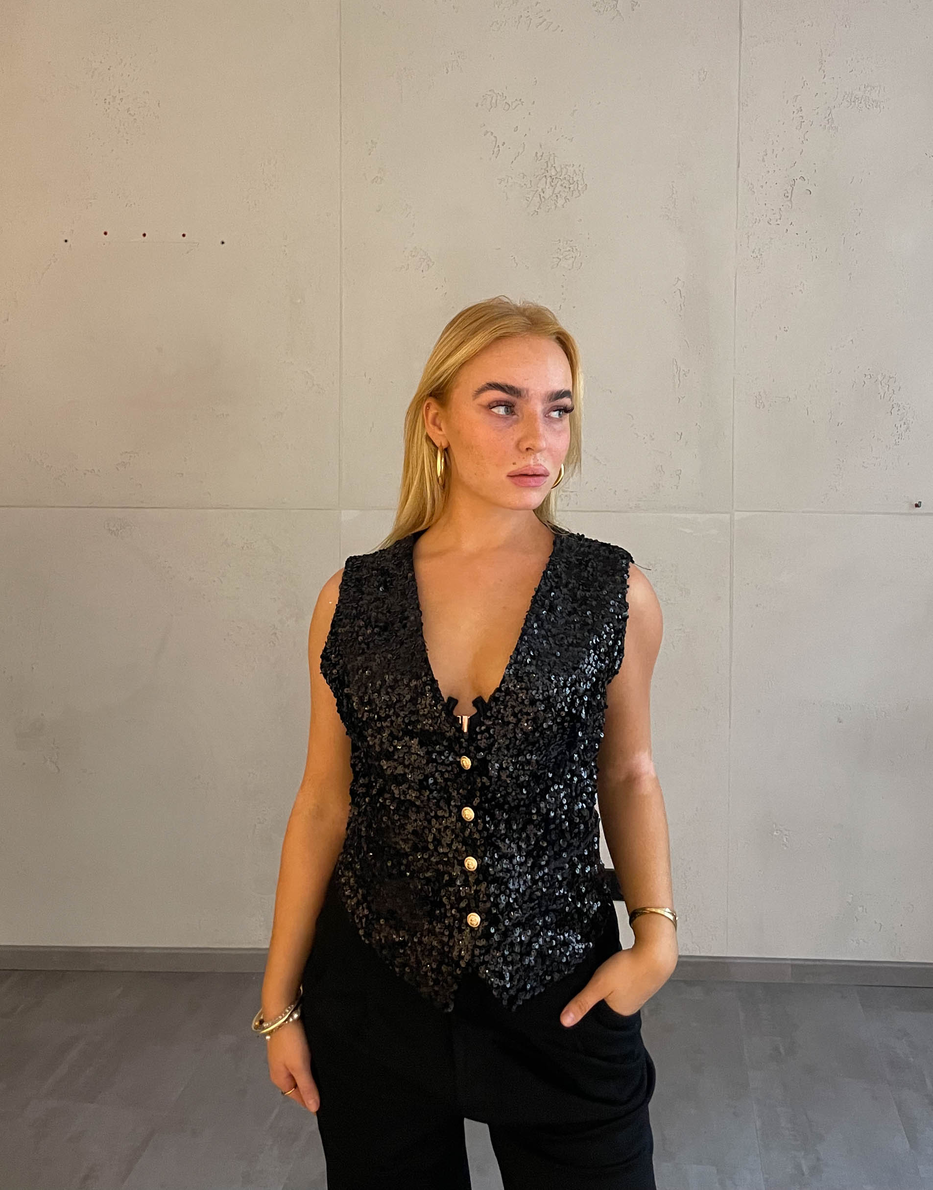 Unsere Pailletten Weste verleiht deinem Outfit den ultimativen Glamour-Touch. Ein Must-Have für besondere Anlässe und stilvolle Events.