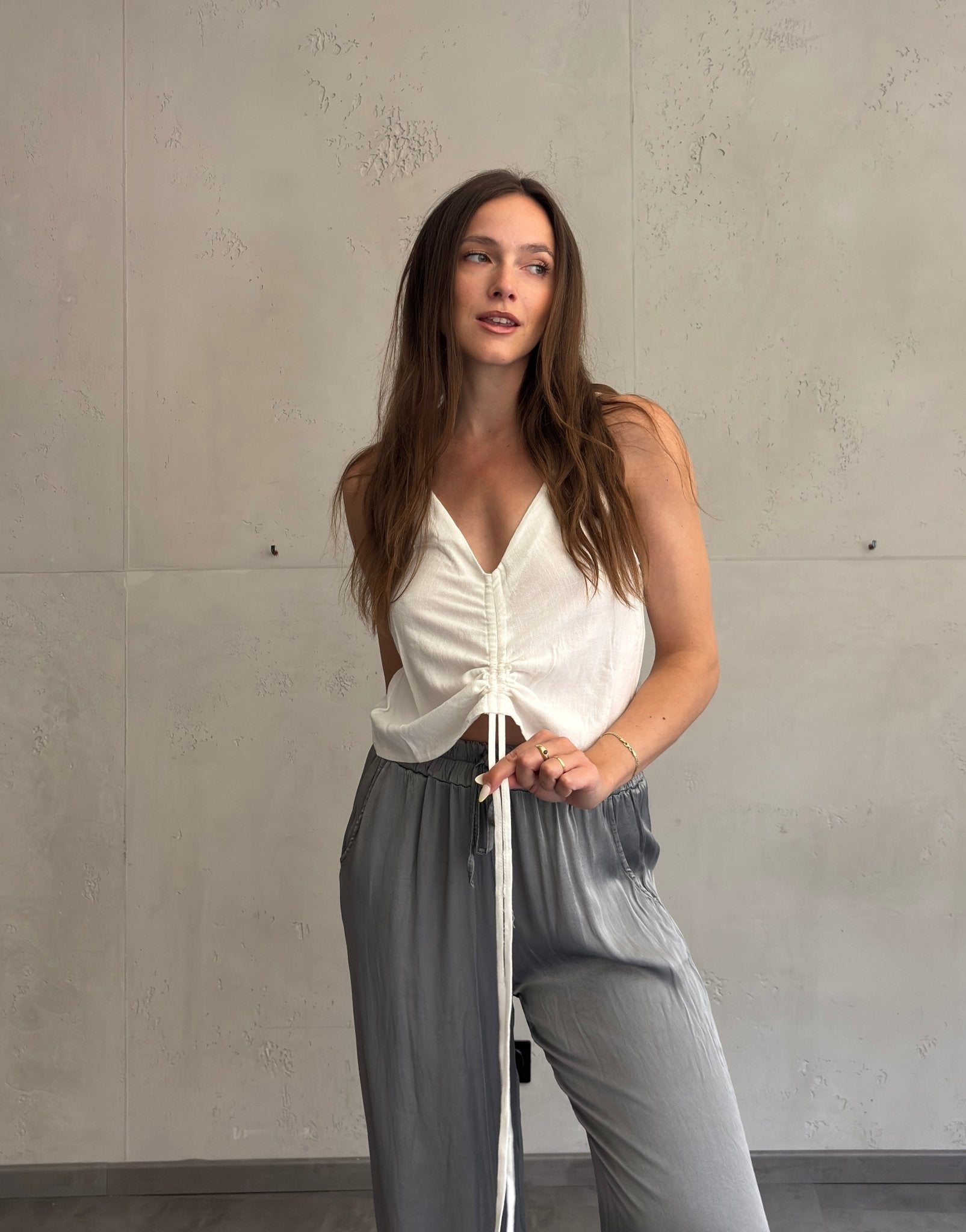 Gerafftes Leinen-Top mit Schnür-Detail & Spaghettiträgern