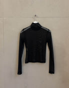 Das Netzoberteil ist in Onesize erhältlich und passt sich durch das elastische Material den meisten Körpergrößen an. Es bietet eine bequeme Passform und ist ideal für Größen zwischen 34 und 40. Das Modell Jovana trägt das Oberteil in der Onesize-Größe und es passt ihr perfekt.