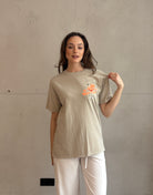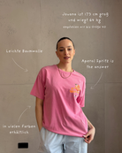 Das T-Shirt ist in Onesize erhältlich und bietet eine lockere Passform, die bis Größe 38 bequem sitzt. Der Schnitt ist zeitlos und schmeichelhaft, ideal für einen entspannten und doch stylischen Look.