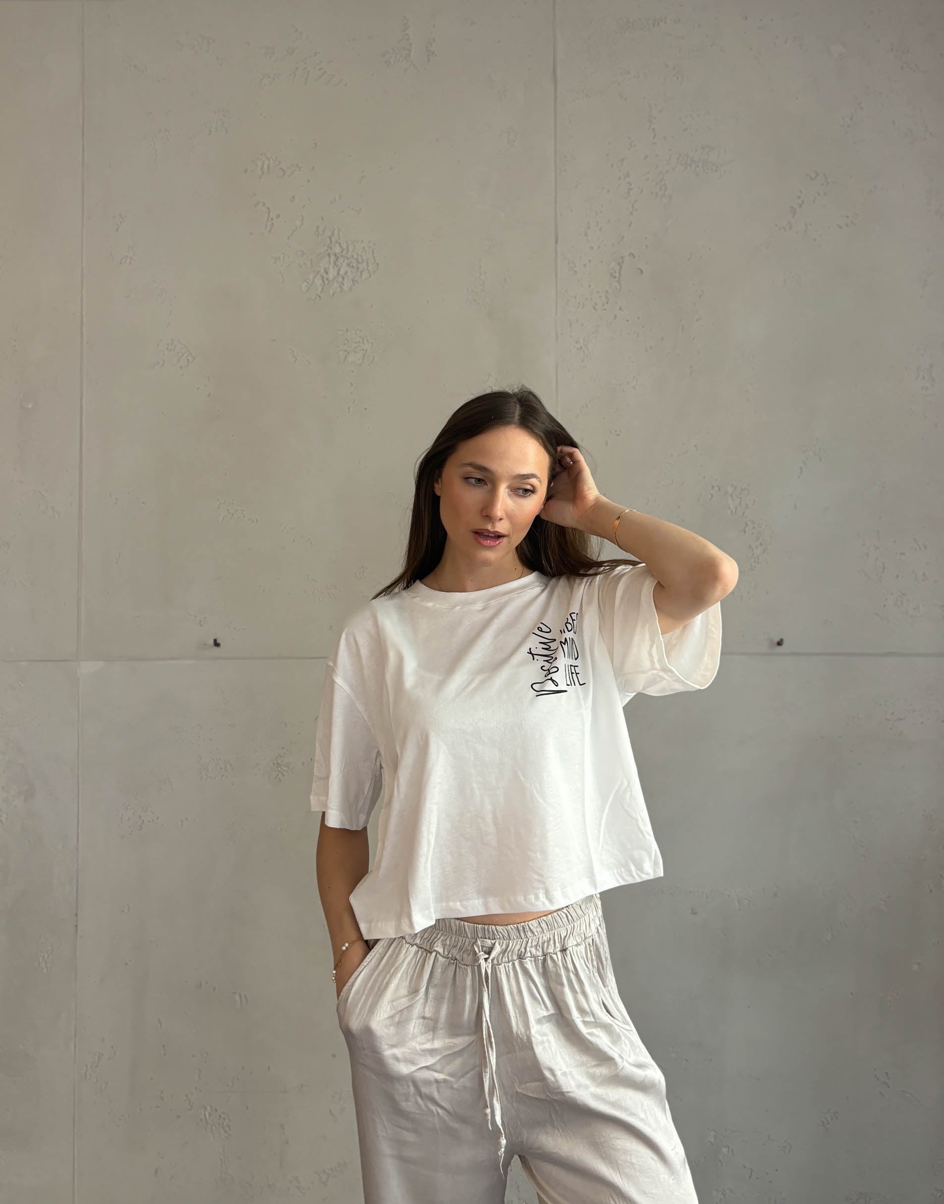 Derzeit verfügbar in strahlendem Weiß, das sich perfekt zu Jeans, Röcken oder Shorts kombinieren lässt. Ergänze den Look mit Sneakern oder Sandalen für eine entspannte Ausstrahlung.