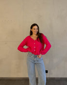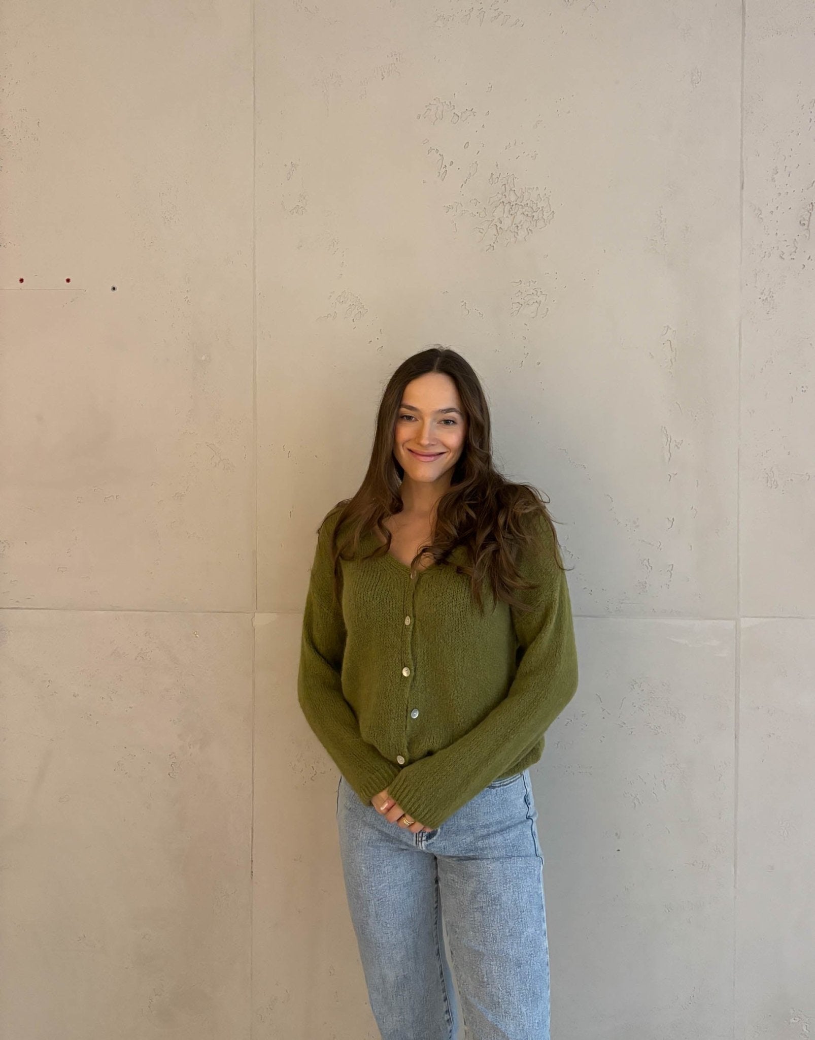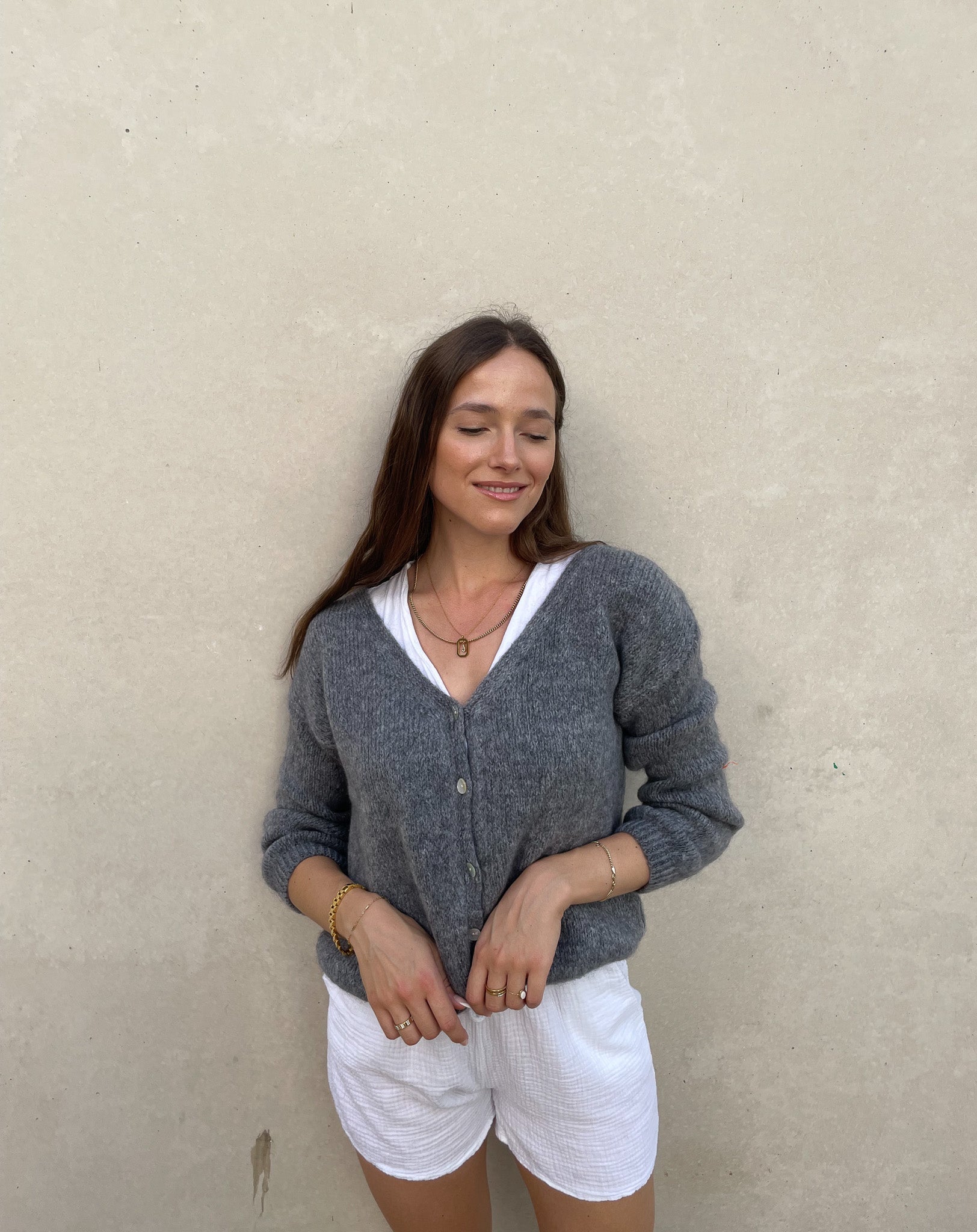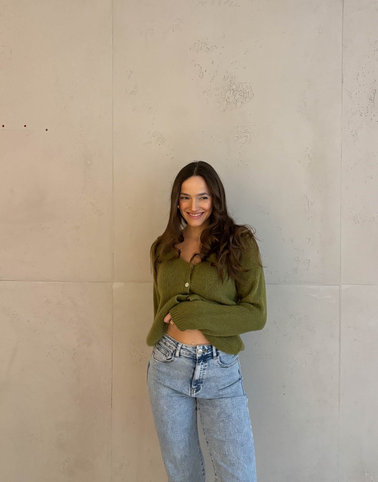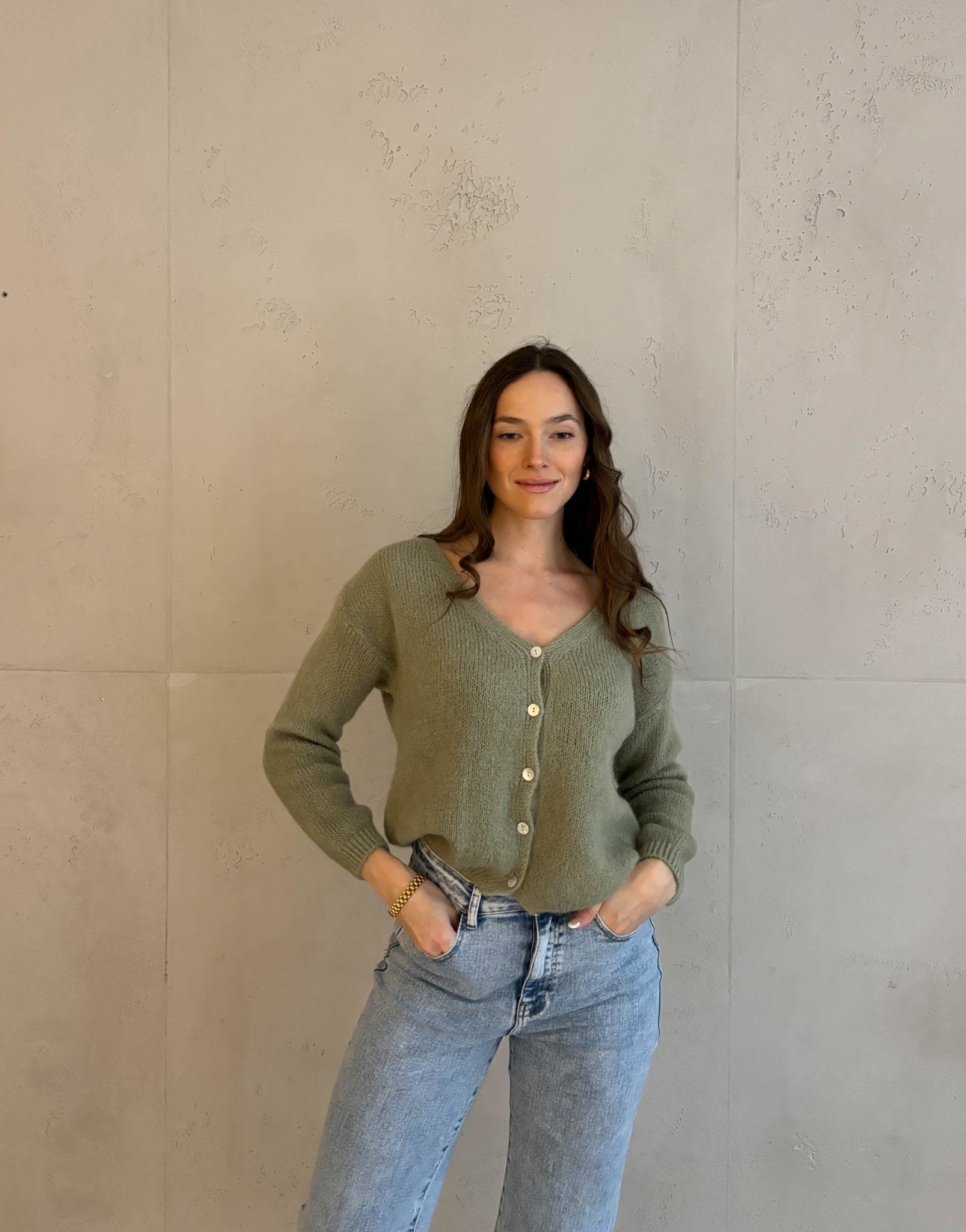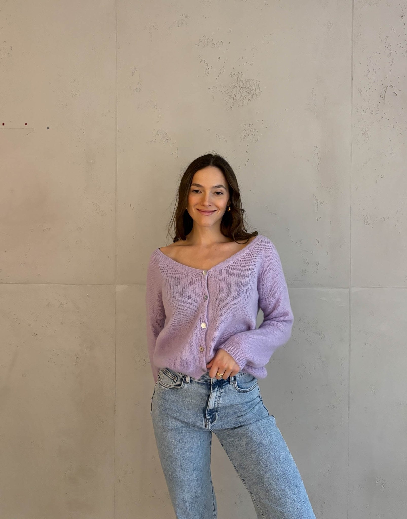 Diese kurze Mohair Strickjacke mit V-Ausschnitt bringt alles mit, was ein modernes Knit-Piece braucht: soften Tragekomfort, angesagte Farben und einen coolen Cut. Der V-Ausschnitt sorgt für eine feminine Silhouette, während die Knöpfe den Look je nach Mood verändern lassen – ob offen getragen für einen entspannten Layering-Style oder zugeknöpft als cozy Statement-Piece.