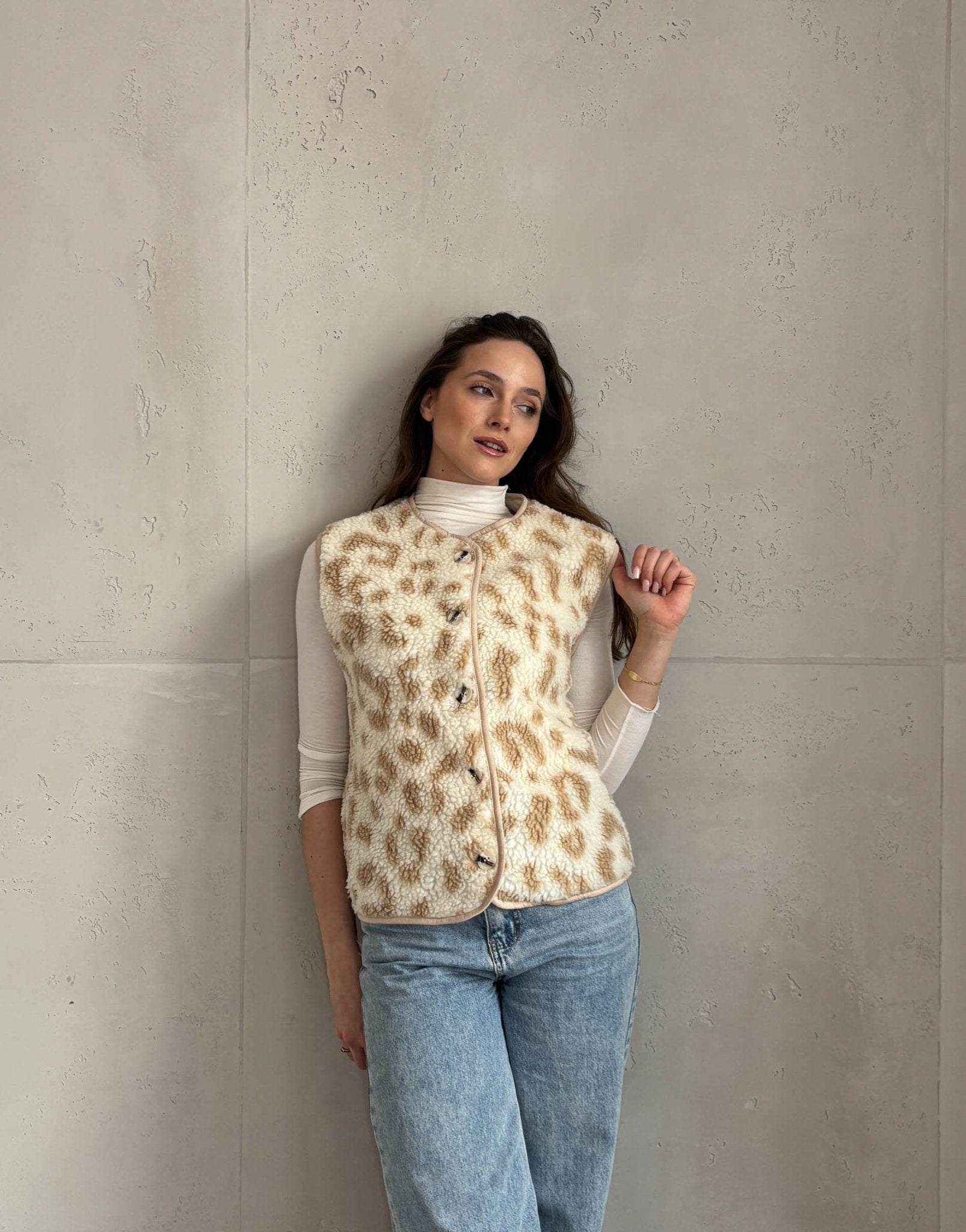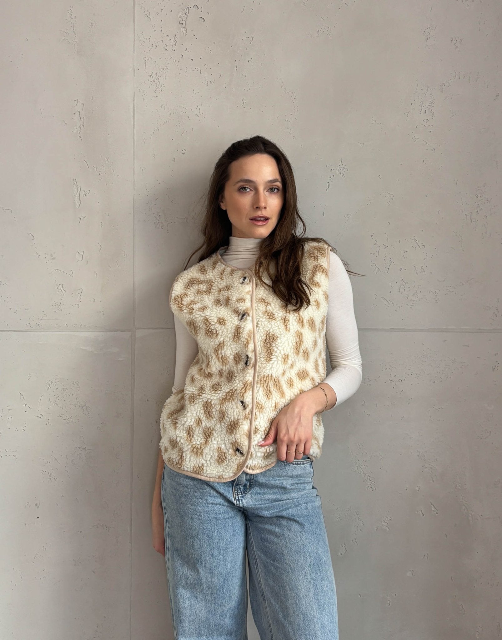 Verleihe deinem Look das gewisse Etwas mit dieser stylischen Leo Fellweste. Mit ihrem auffälligen Muster und der eleganten Knopfleiste ist sie ein echtes Statement-Piece für jede Modebewusste.