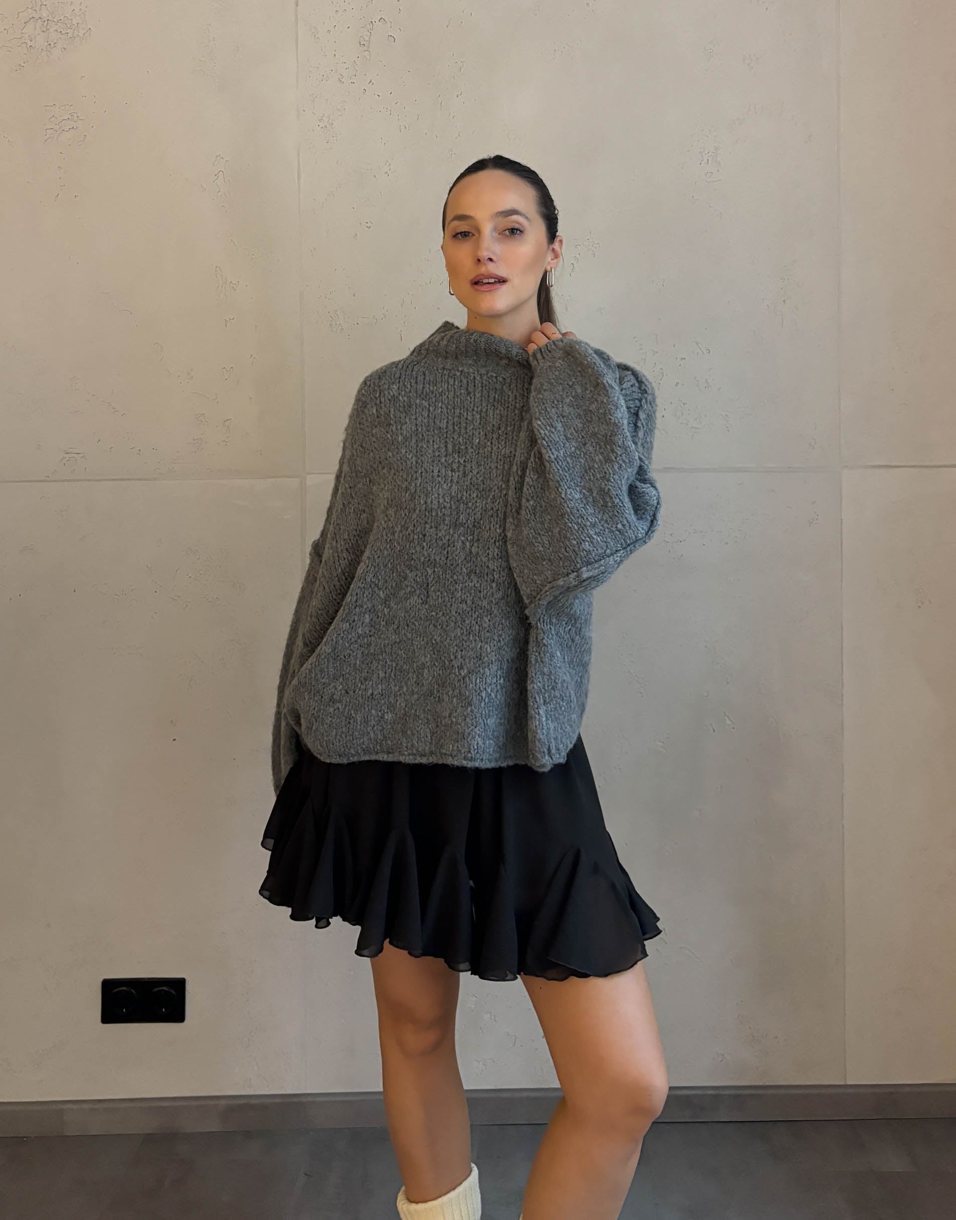 Das Material aus 38% Acryl, 32% Polyamid, 18% Wolle und 12% Mohair sorgt für ein super weiches Tragegefühl und hält dich auch an kühleren Tagen angenehm warm. Der Pullover kommt in One-Size und passt sich dank des lockeren Schnitts gut verschiedenen Körperformen an. Der Stehkragen, die überschnittenen Schultern und die weiten Ärmel sorgen für eine entspannte, moderne Silhouette.
