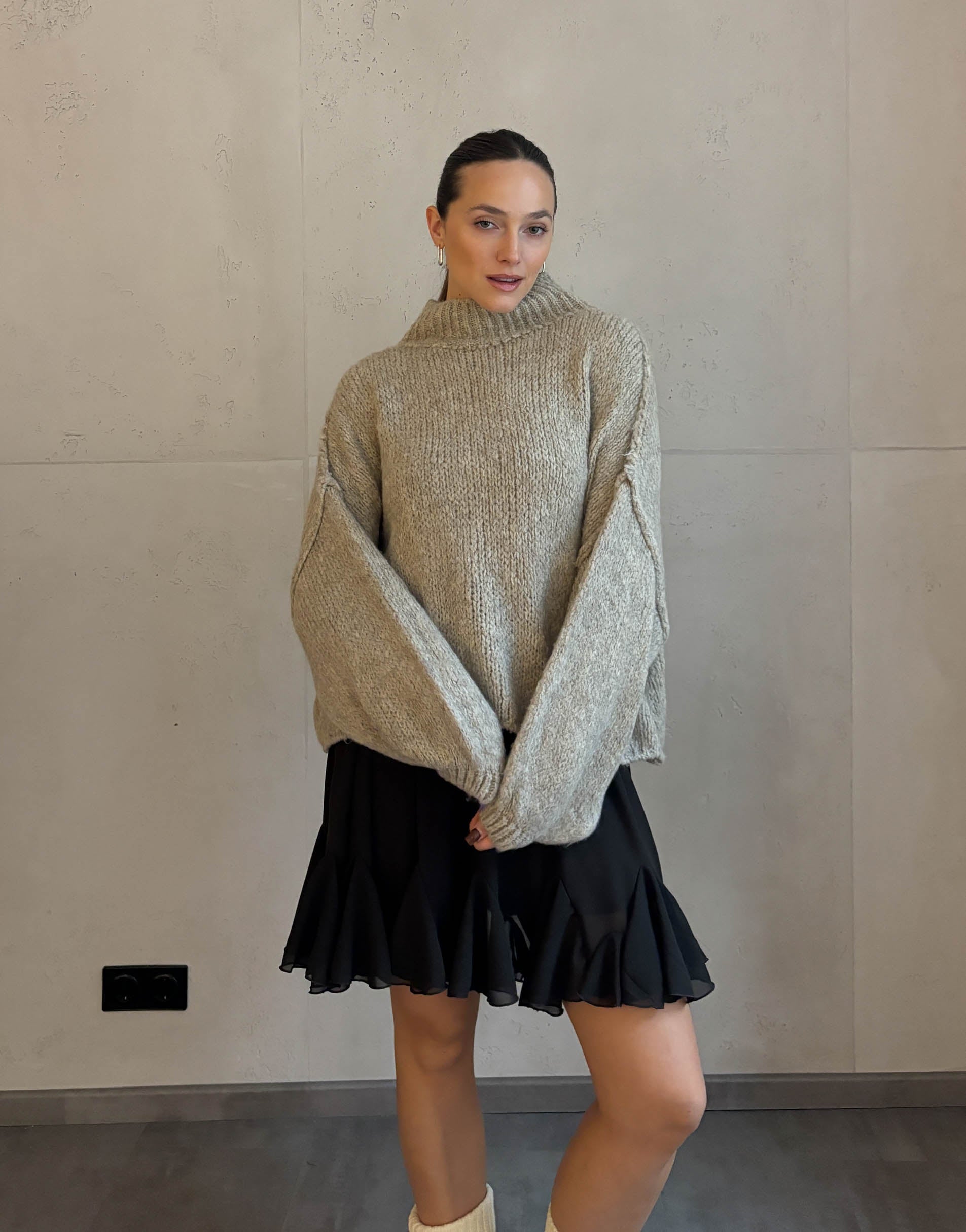 Der kurze Stehkragen Strickpullover vereint Komfort und Stil auf perfekte Weise. Die weiten Ärmel und der Oversize Fit machen diesen Pullover zu einem echten Trend-Piece, das sich sowohl für entspannte Alltagslooks als auch für schickere Outfits eignet. Mit dem Stehkragen bleibt es auch an kühleren Tagen angenehm warm, während die Außennähte und der Gummizug am Abschluss für ein modernes, strukturiertes Design sorgen.